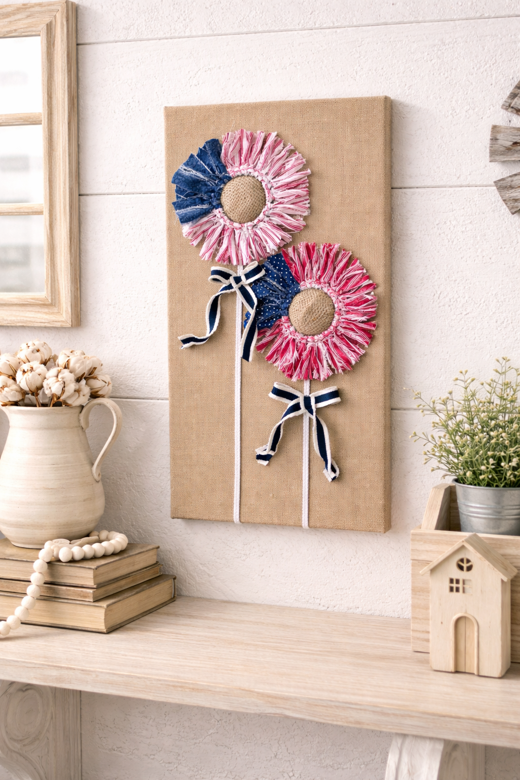 Each flower is carefully made with a mix of denim, striped, and patterned fabrics, finished with natural burlap centers for that perfect rustic look. Set on a burlap-wrapped canvas and accented with coordinating ribbon bows, this piece is ready to hang and display.